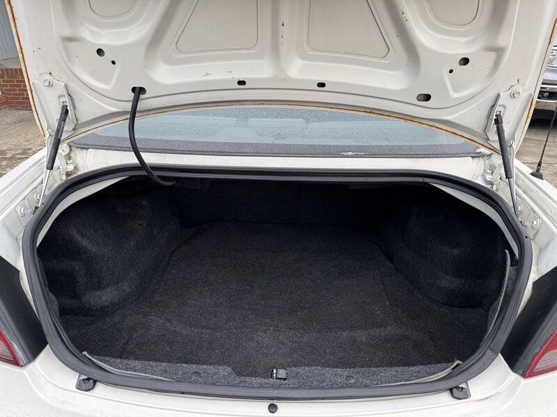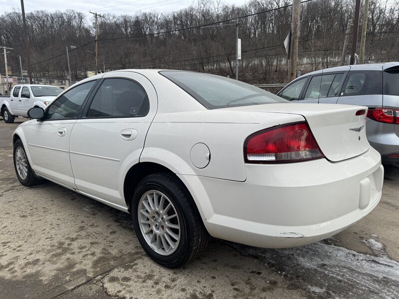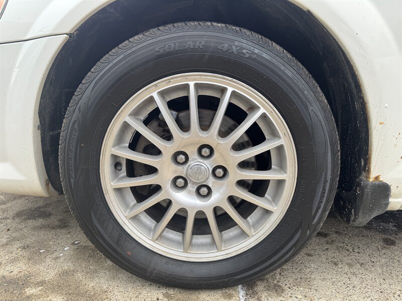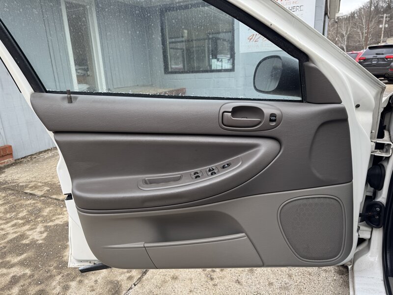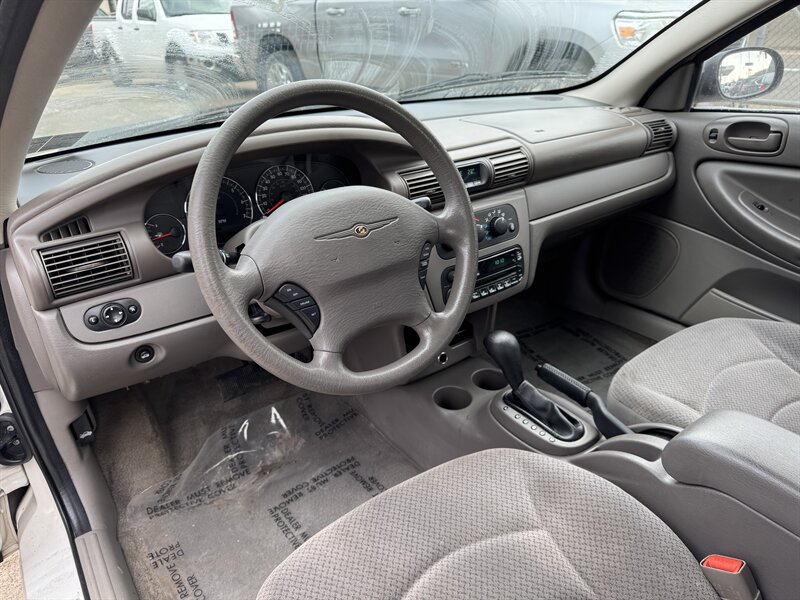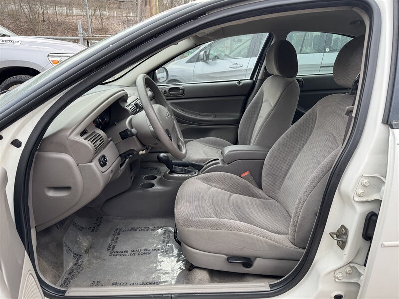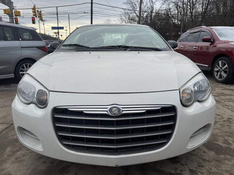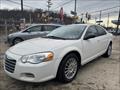 2004 Chrysler Sebring in Stone White Clearcoat with a Dark Slate Gray interior. Powered by a 2.0L DOHC 16-valve engine, it is rated at about 20 MPG city and 27 MPG highway. Factory-standard equipment includes air conditioning, power windows and door locks, cloth seating, a tilt steering column, an AM/FM stereo with CD player, intermittent wipers and a split-folding rear seat. Standard safety and chassis items include dual front airbags, three-point seat belts, child-seat anchors (LATCH) and front disc/rear drum brakes.