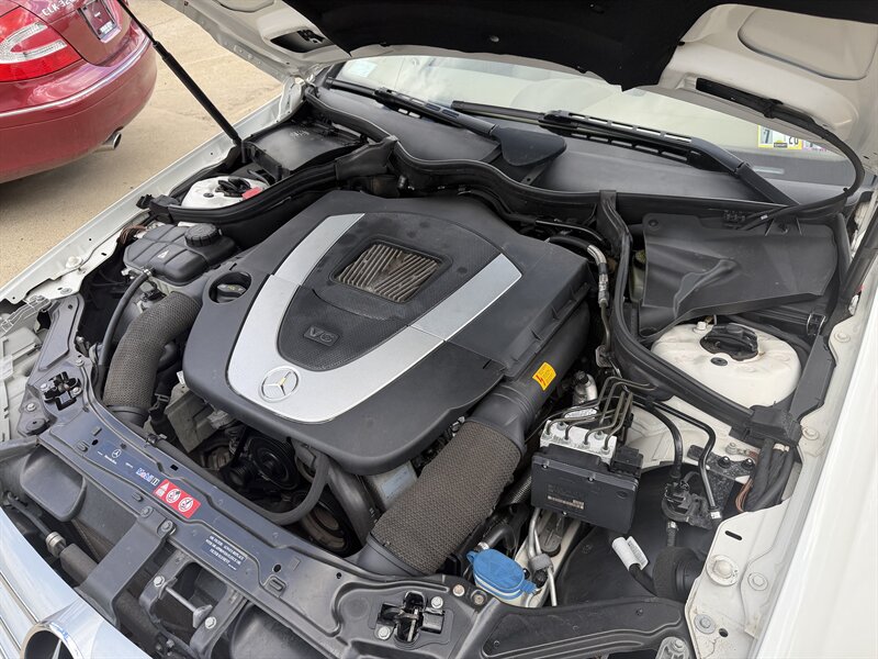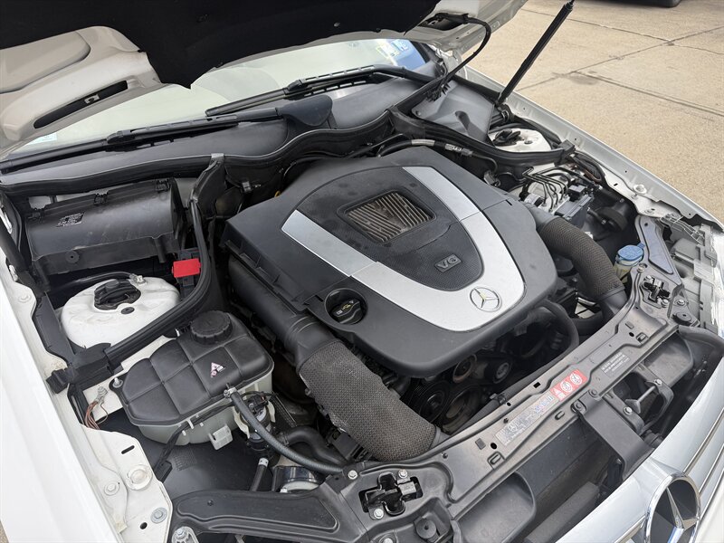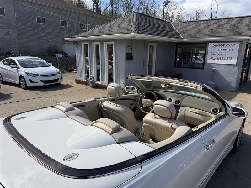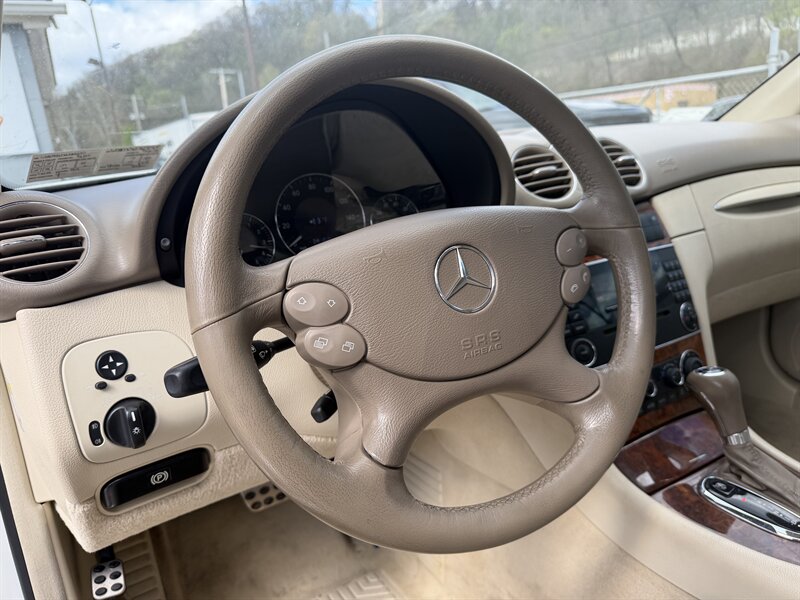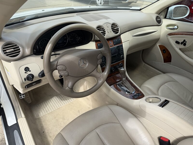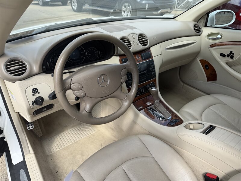 2006 Mercedes-Benz CLK 350 in Alabaster White with Brown leather interior. Powered by a 3.5L V6 producing 268 hp and 258 lb-ft of torque, this example has under 93,000 miles (averaging less than 5,000 miles per year) and EPA ratings of about 16 MPG city / 24 MPG highway.