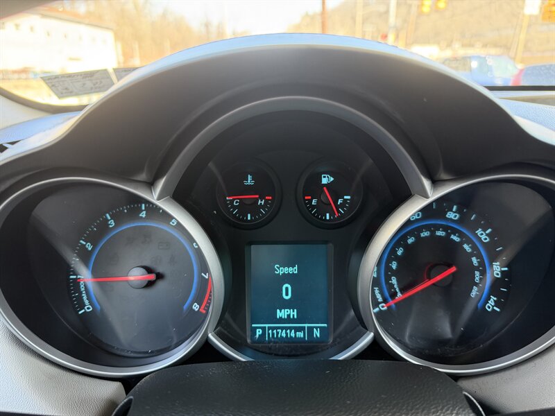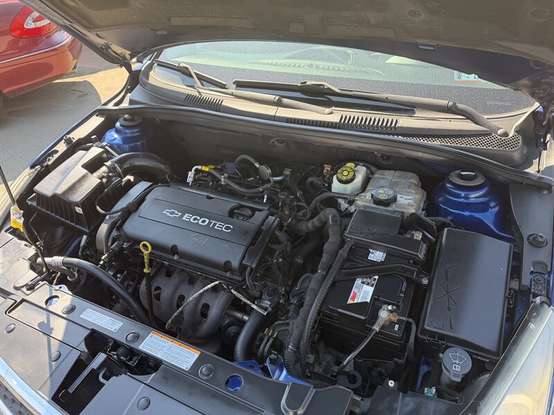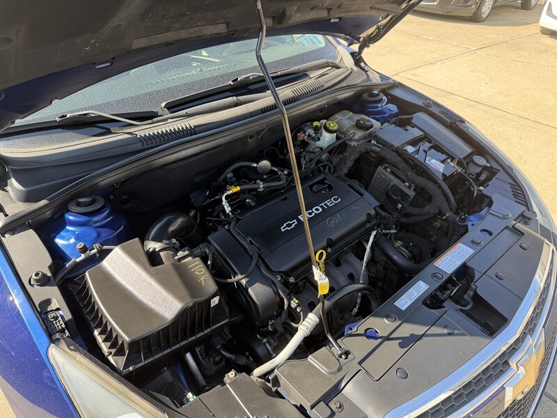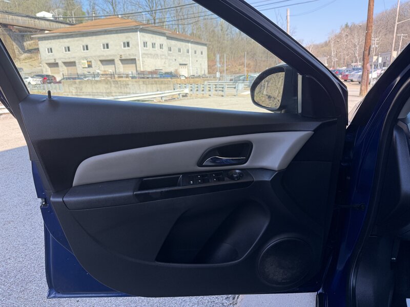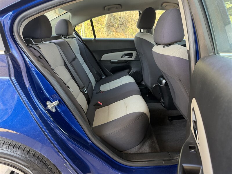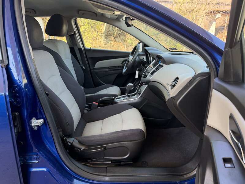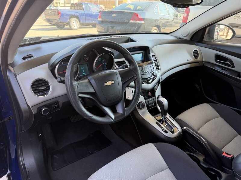 2012 Chevrolet Cruze LS in blue with a gray cloth interior. Powered by an Ecotec 1.8L FlexFuel I4 producing 138 hp and 125 lb-ft of torque, paired with automatic transmissions. Factory-equipped with air conditioning, cruise control, power windows and door locks, intermittent wipers, and a basic AM/FM/CD audio system with auxiliary input. Safety features include four-wheel antilock disc brakes, traction control, stability control, front and side-impact airbags with full-length side curtain airbags, and a tire pressure monitoring system. 15-inch steel wheels with covers and a 60/40 split-folding rear seat provide practicality. Mileage is below 118,000 miles, averaging under 8,000 miles per year.
