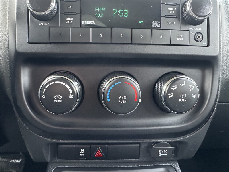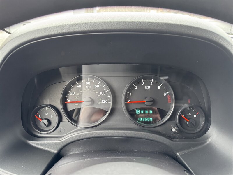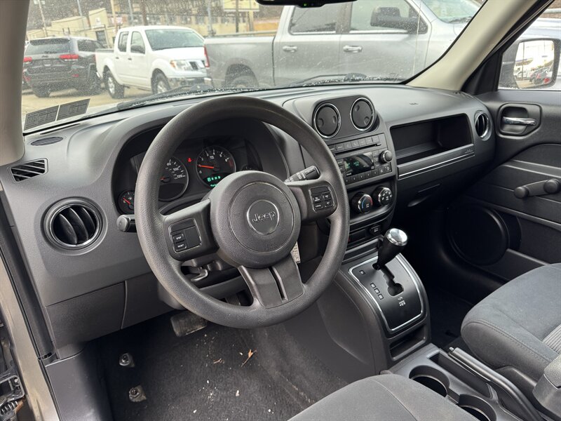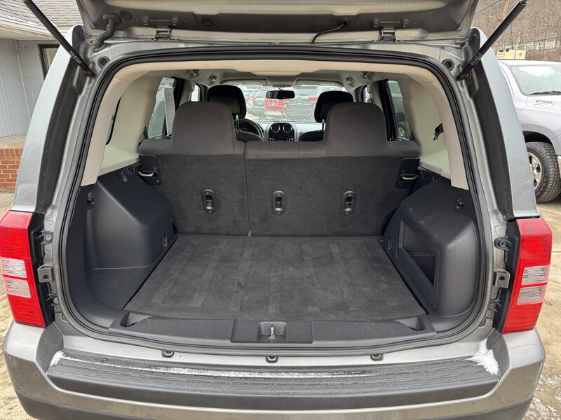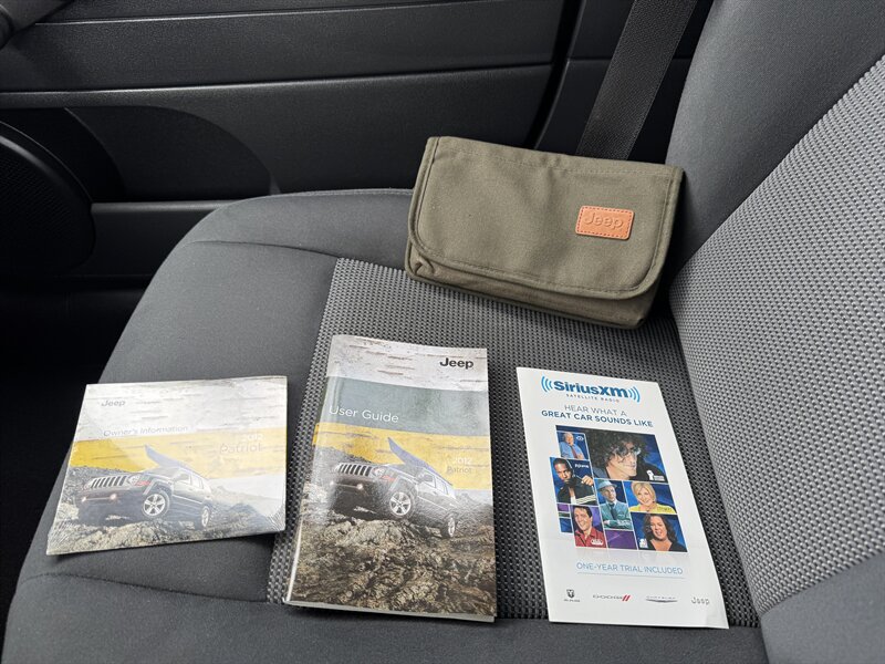 2012 Jeep Patriot Sport in Mineral Gray Metallic Clear Coat with a Dark Slate Gray/Light Pebble Beige cloth interior, powered by a 2.4L I4 engine making 172 hp and 165 lb-ft of torque; EPA-rated at 22 MPG city and 28 MPG highway. Factory-standard equipment includes air conditioning, AM/FM/CD/MP3 audio with auxiliary input, cloth seats with a 60/40 split-folding rear bench, manual seat adjustments and a tilt steering column. Standard safety and convenience features include dual front airbags, front side and curtain airbags, anti-lock brakes, electronic stability and traction control, tire-pressure monitoring, power windows and locks, remote keyless entry and 16-inch steel wheels.