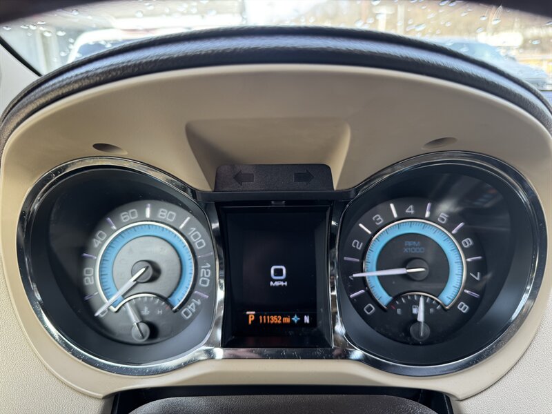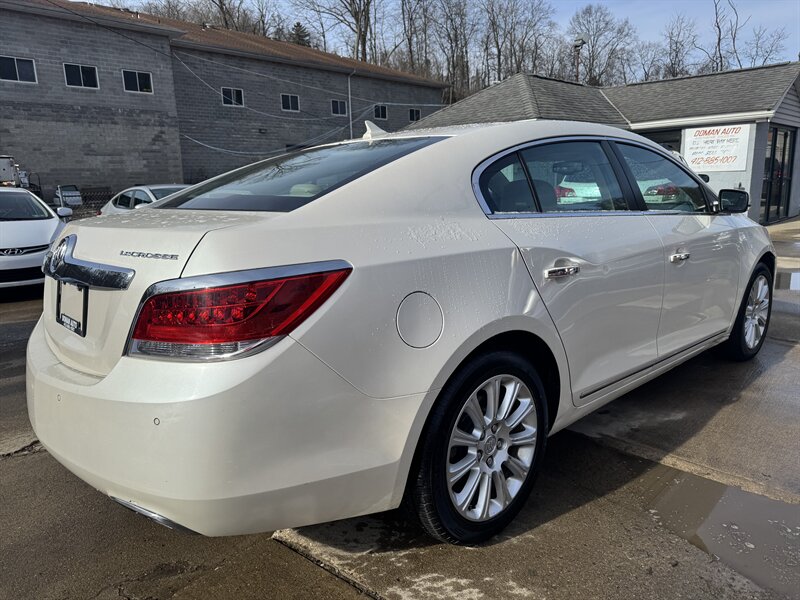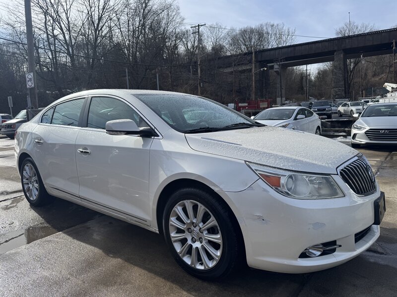 2013 Buick LaCrosse Premium I in White Diamond Tricoat with Titanium leather interior, powered by a 3.6L FlexFuel V6 (303 hp, 264 lb-ft) mated to an automatic and front-wheel drive. Factory equipment typically includes leather-appointed seating with heated front seats and power-adjustable driver and passenger seats, dual-zone automatic climate control, keyless entry with remote start, steering-wheel-mounted audio and cruise controls, Bluetooth hands-free phone and audio streaming, AM/FM/CD with auxiliary/USB inputs and satellite radio, premium alloy wheels, and power windows/locks/mirrors. Standard safety and convenience features include ABS, stability and traction control, multiple airbags and OnStar; this vehicle has desirable mileage with under 112,000 miles (averaging less than 8,000 miles/year).