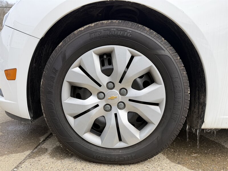 2013 Chevrolet Cruze LS Auto powered by the Ecotec 1.8L FlexFuel I4 (138 hp, 125 lb-ft), finished in Summit White with a Jet Black/Titanium cloth interior. Factory equipment includes automatic transmission, air conditioning, power windows and door locks, remote keyless entry, cruise control, tilt steering, AM/FM/CD stereo with auxiliary/USB inputs and Bluetooth hands-free capability, steering-wheel audio controls, 60/40 split-folding rear seat, cloth seating, intermittent wipers, power mirrors, and standard safety features such as ABS, stability and traction control, front and side-impact airbags and full-length side curtain airbags with a tire pressure monitoring system. Below 123,000 miles, averaging under 9,000 miles per year.