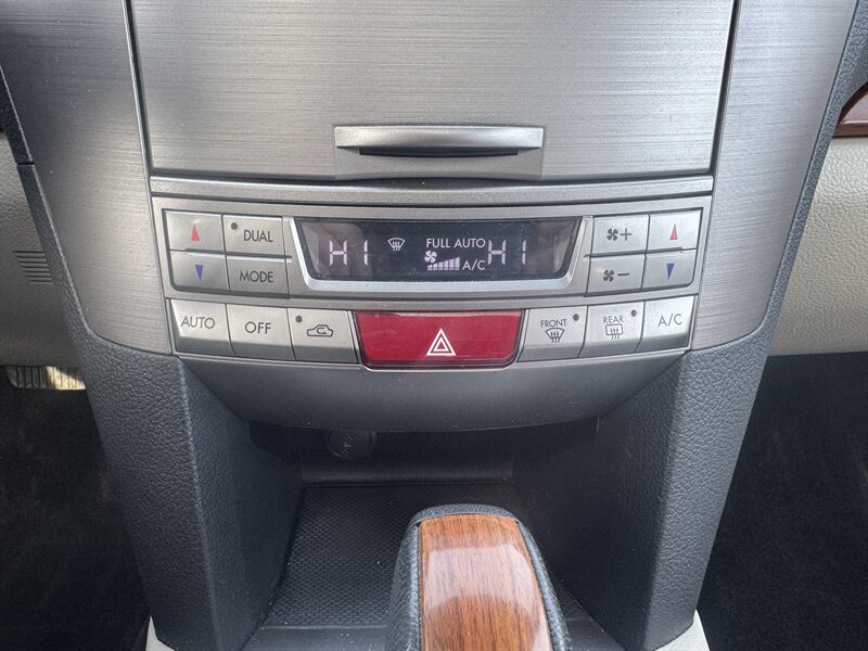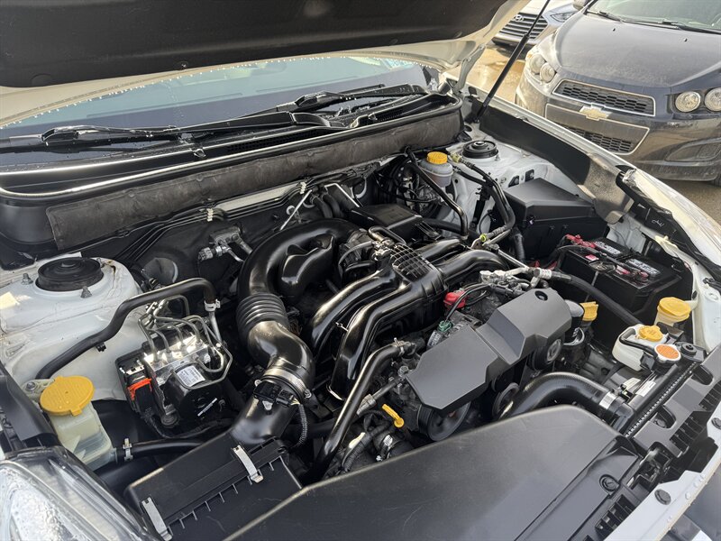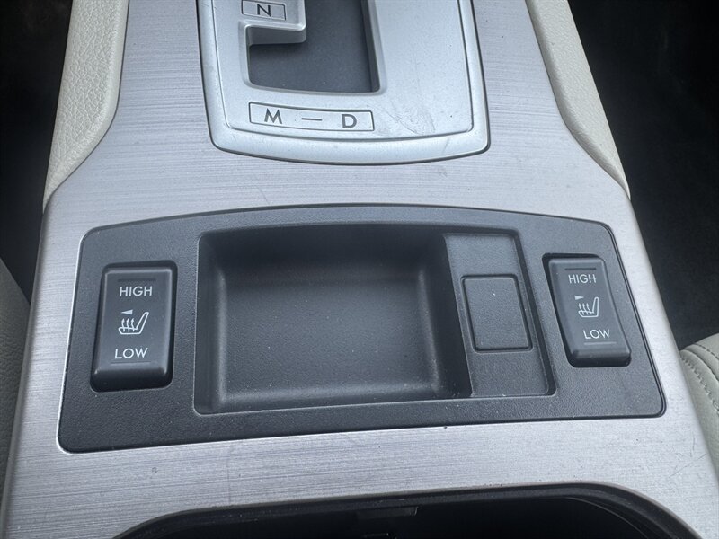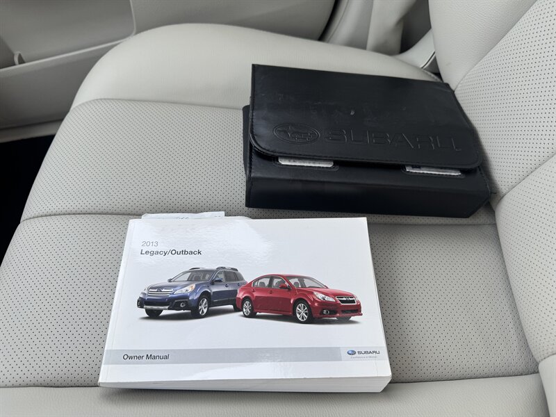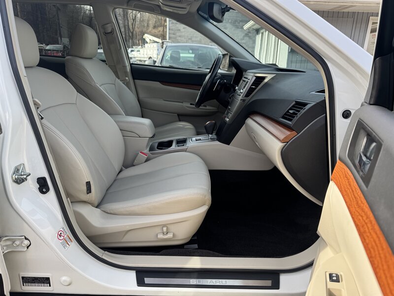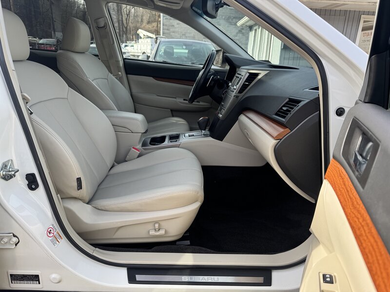 2013 Subaru Outback 2.5i Limited in Satin White Pearl with Warm Ivory interior, powered by a 2.5L H4 producing 173 hp and 174 lb-ft, Symmetrical All-Wheel Drive with Lineartronic CVT, under 92,000 miles (averaging <7,000 miles/yr) and rated 24 MPG city / 30 MPG highway. Factory equipment includes leather-trimmed heated front seats, eight-way power driver seat with lumbar, dual-zone automatic climate control, power moonroof, fog lights, alloy wheels and roof rails, remote keyless entry and cruise control, Bluetooth hands-free/ audio, AM/FM/CD with AUX/USB inputs and steering-wheel audio controls, 60/40 split-folding rear seat with center armrest, ABS with EBD, stability and traction control, front and side-curtain airbags, and tire pressure monitoring.