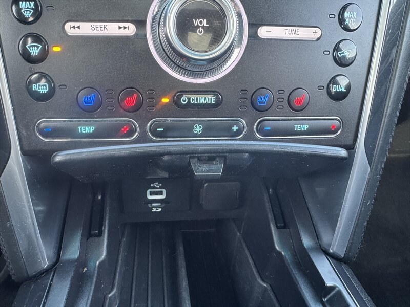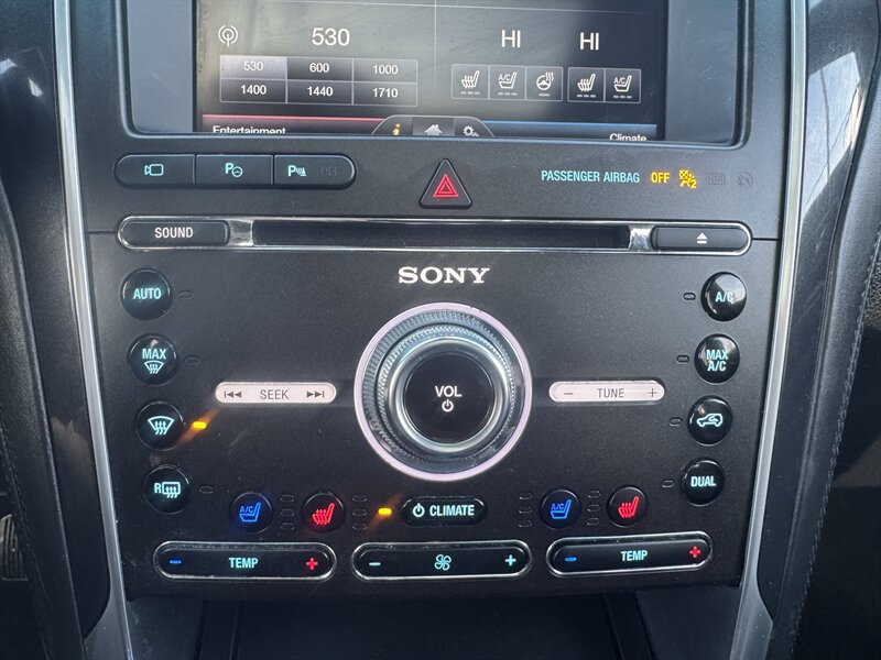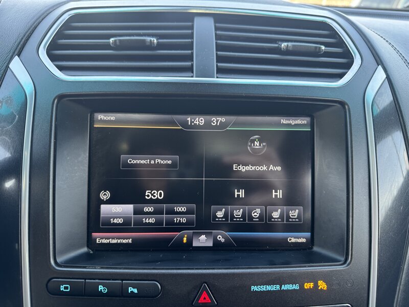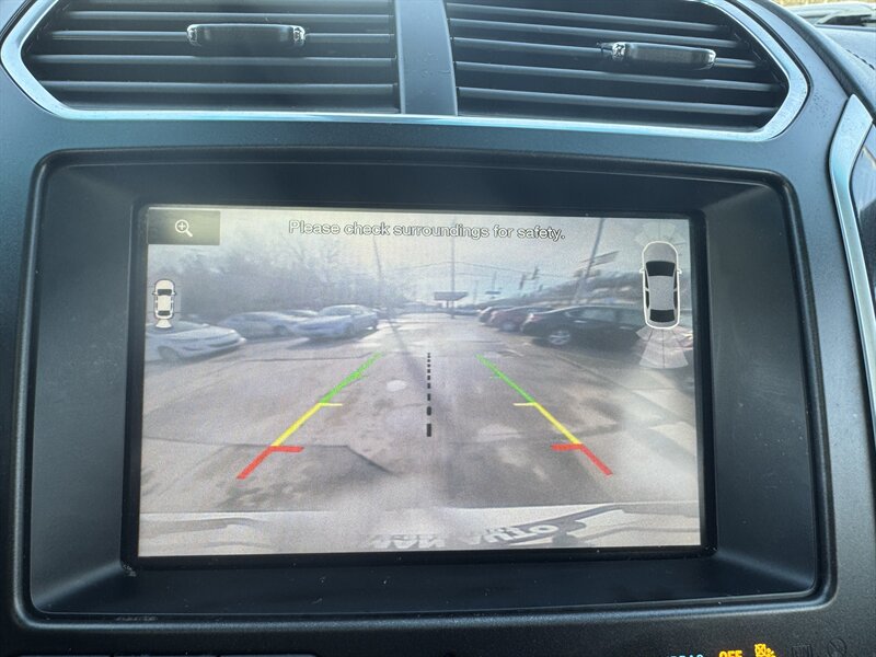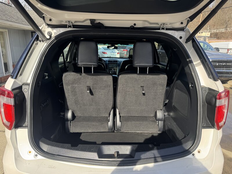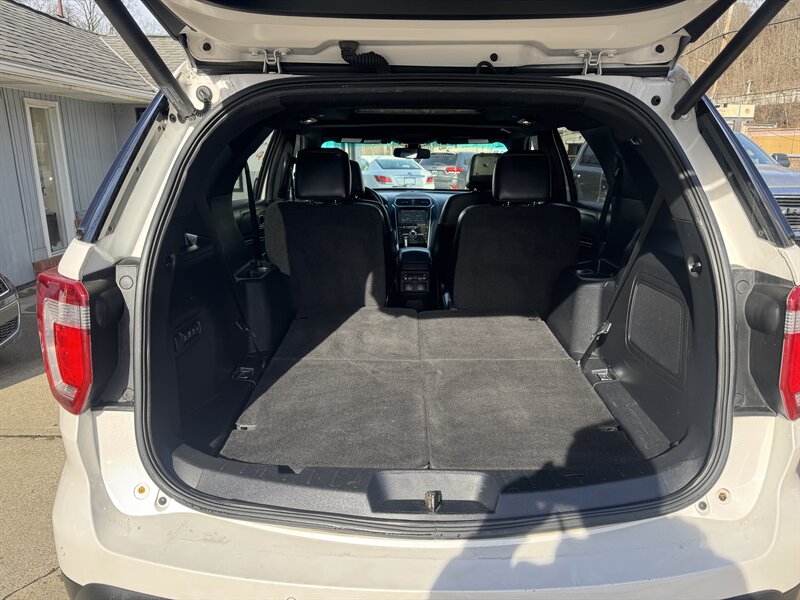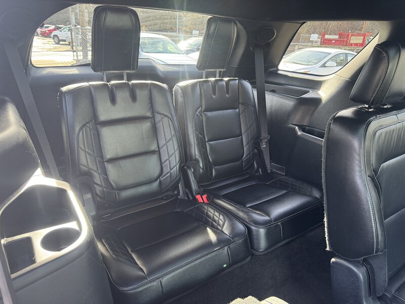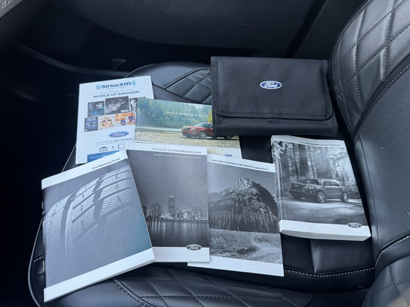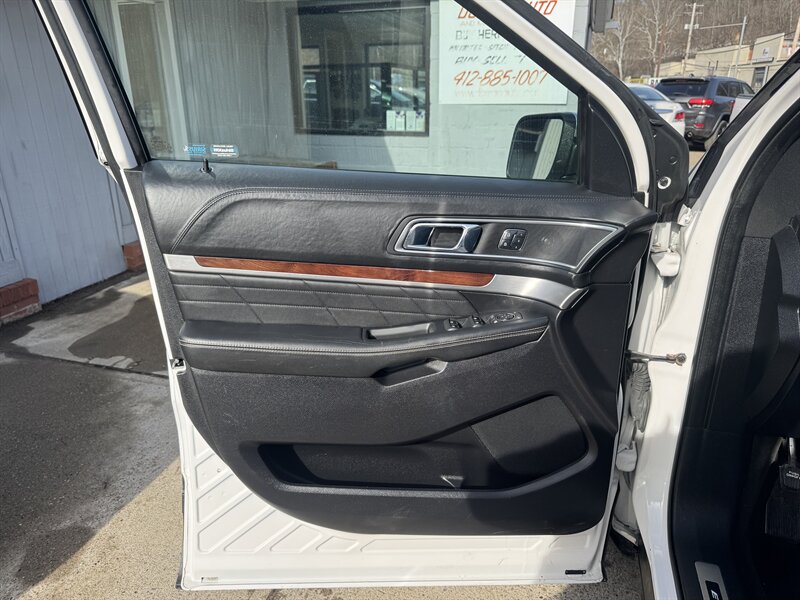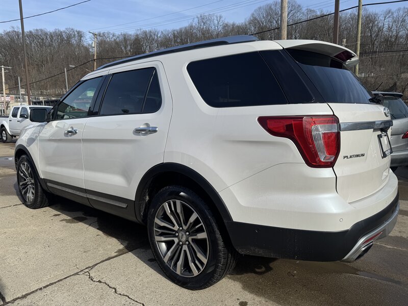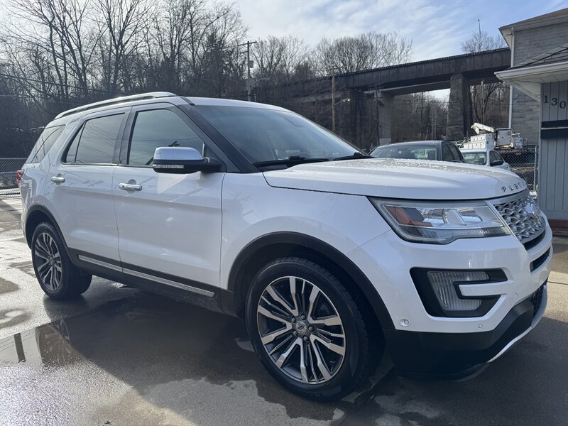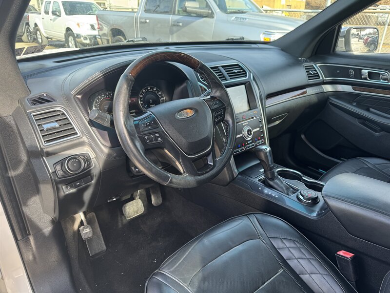 2016 Ford Explorer Platinum powered by an EcoBoost 3.5L twin-turbo V6 producing 365 hp and 350 lb-ft of torque. Finished in White Platinum Metallic Tri-Coat with Medium Soft Ceramic leather interior, this Explorer returns an EPA-estimated 16 MPG city / 22 MPG highway. Factory-equipped comfort and convenience features include leather-trimmed seating with heated and ventilated front seats, power-adjustable front seats with memory, a heated leather steering wheel, tri-zone automatic climate control, keyless entry with push-button start and remote start, and a power liftgate. Standard infotainment and connectivity come via a factory touchscreen with Bluetooth and voice controls, while safety and driver-assist equipment include a rearview camera, blind-spot monitoring with rear cross-traffic alert, parking sensors, full airbag system, ABS, traction and stability control.